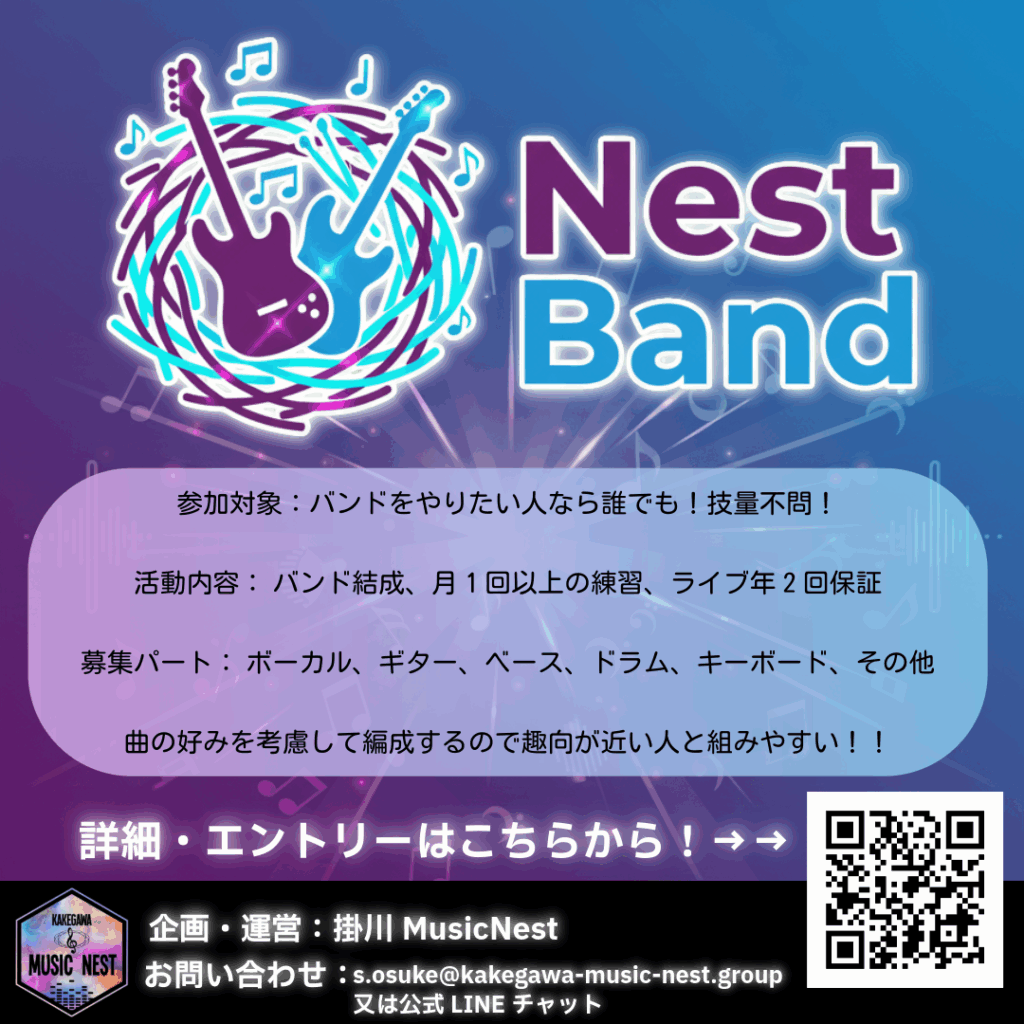 そんなあなたのために、新しい企画「Nest Band(サークル内バンド結成・ライブプログラム)」が始動します!